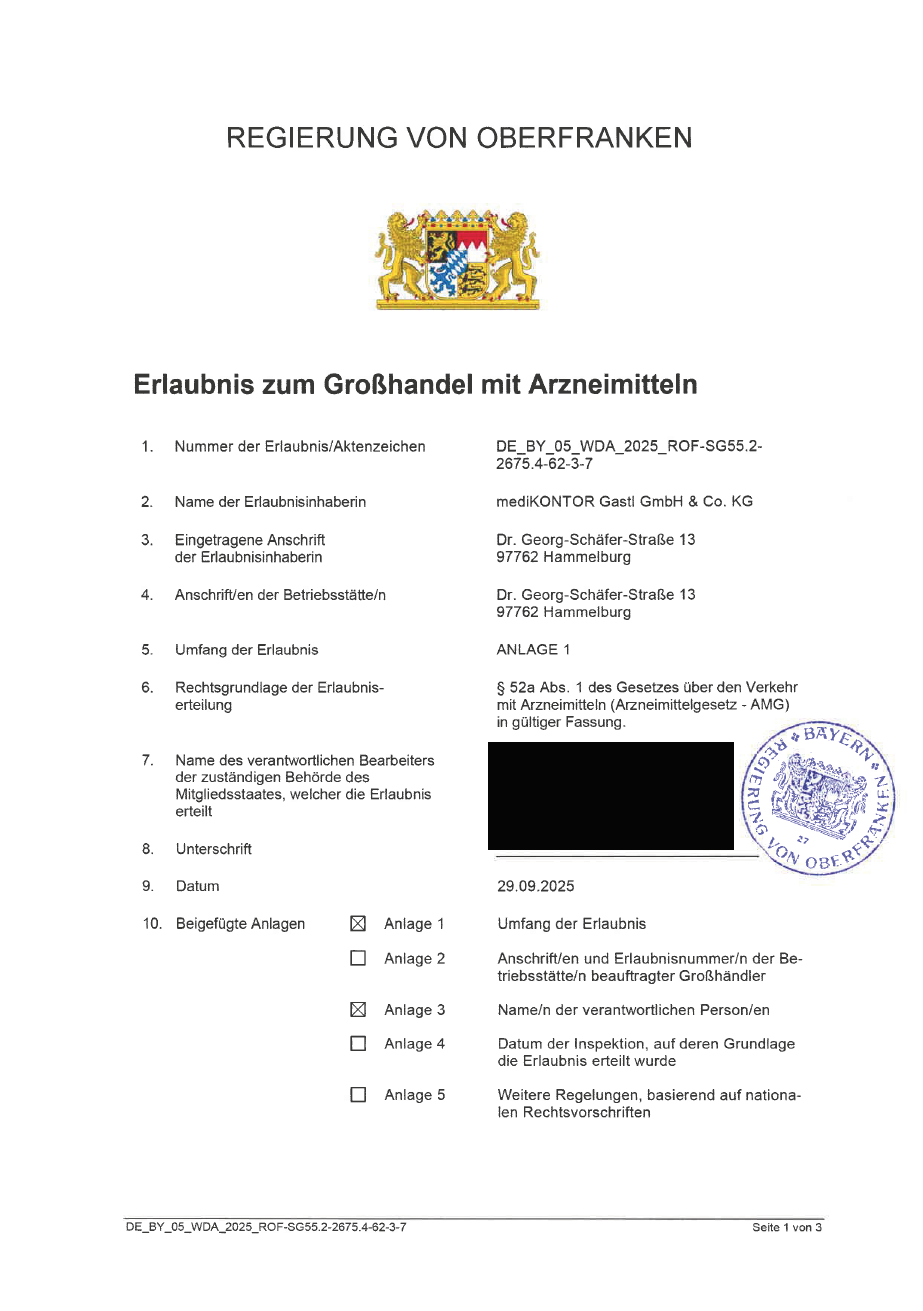 Erlaubnis zum Großhandel mit Arzneimitteln Jetzt auch zertifiziert für die Abgabe von Desinfektionsmitteln Infusions- und Spüllösungen Hier gehts zum Zertifikat